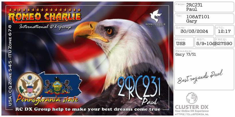 Confirmed contact with Paul 2RC231 Pennsylvania USA.