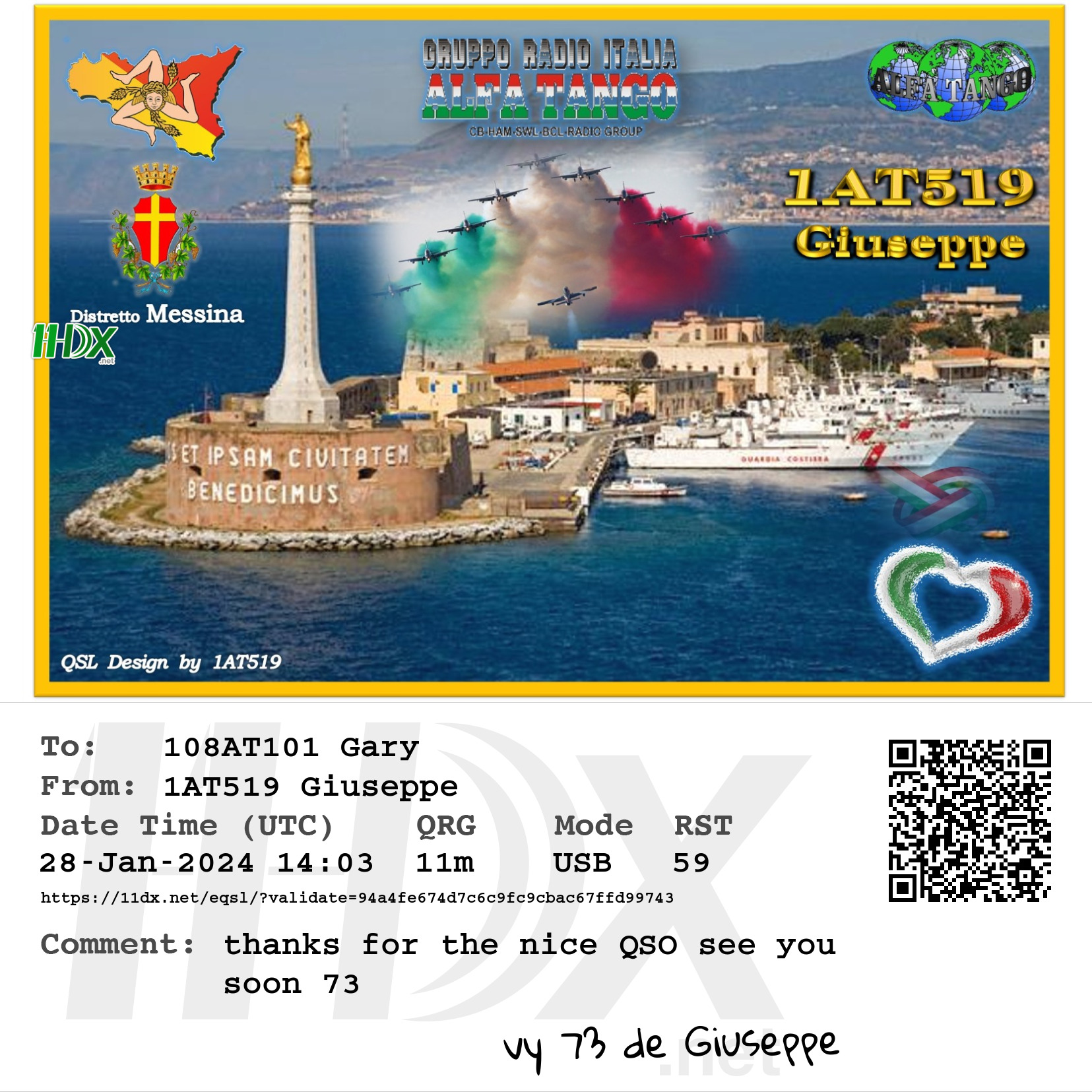 Confirmed contact again with Giuseppe - 1AT519 Messina Sicily, Italy.