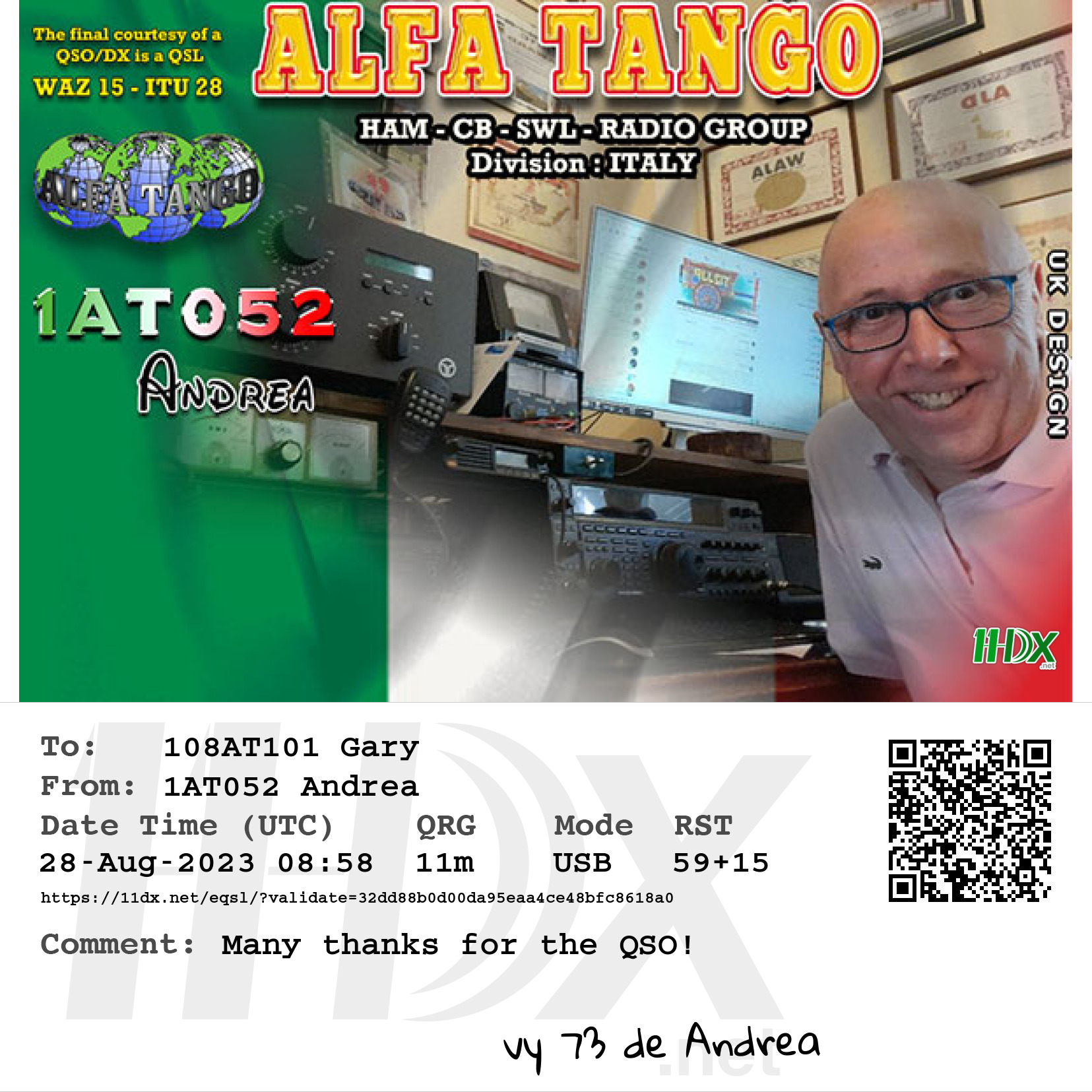 Confirmed contact with Andrea 1AT052 Italy.