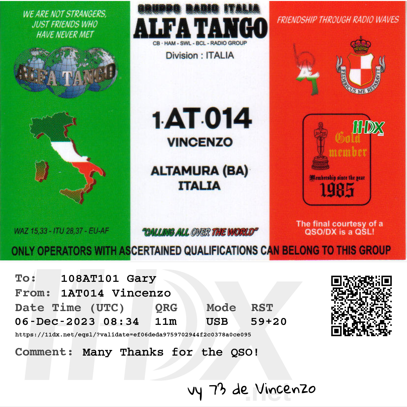 Confirmed contact with Vincenzo 1AT014 Italy.
