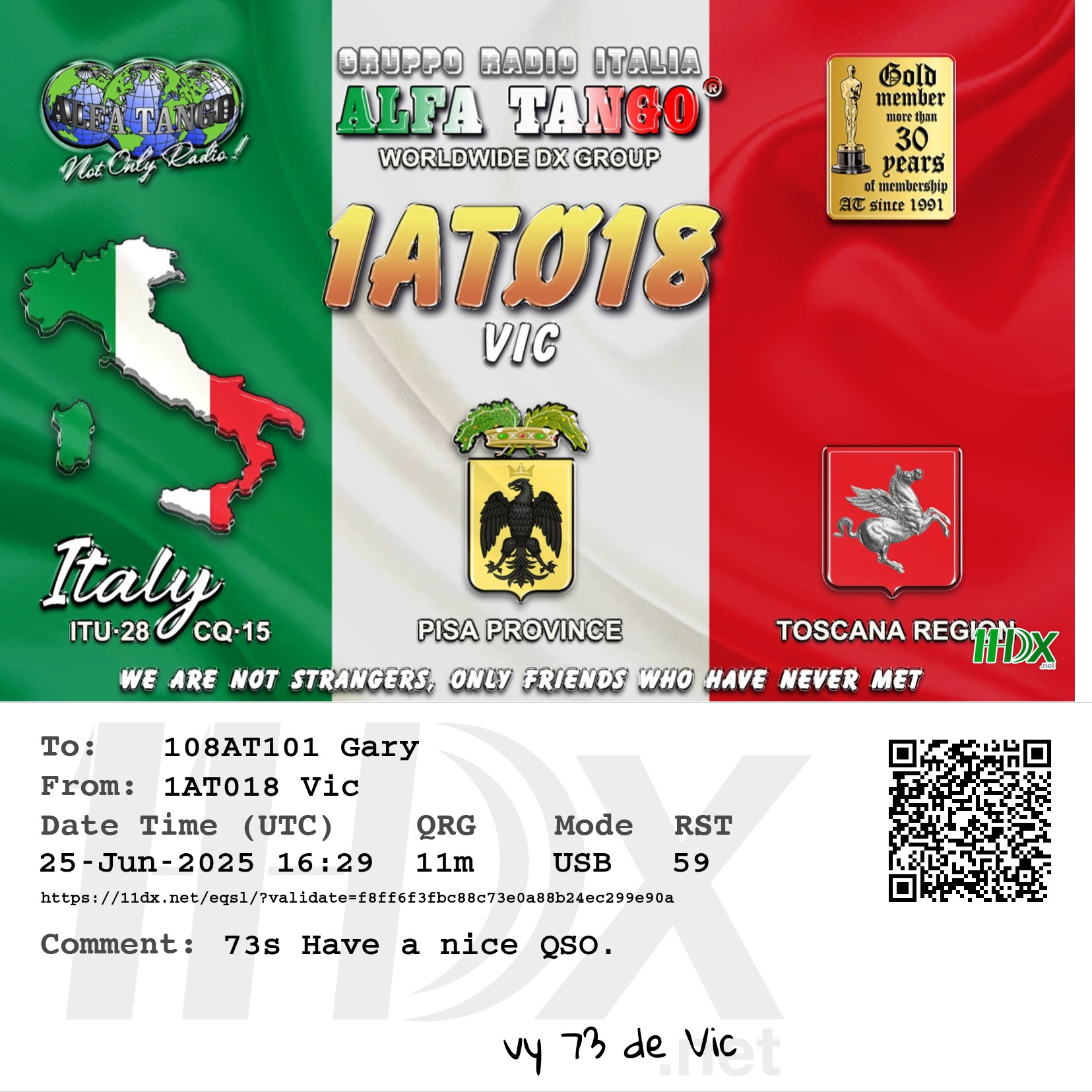 Confirmed contact with Vic 1AT018 Pisa, Toscana, Italy.