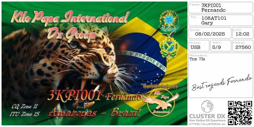 Confirmed contact with Fernando 3KPI001 Amazonas Brazil.